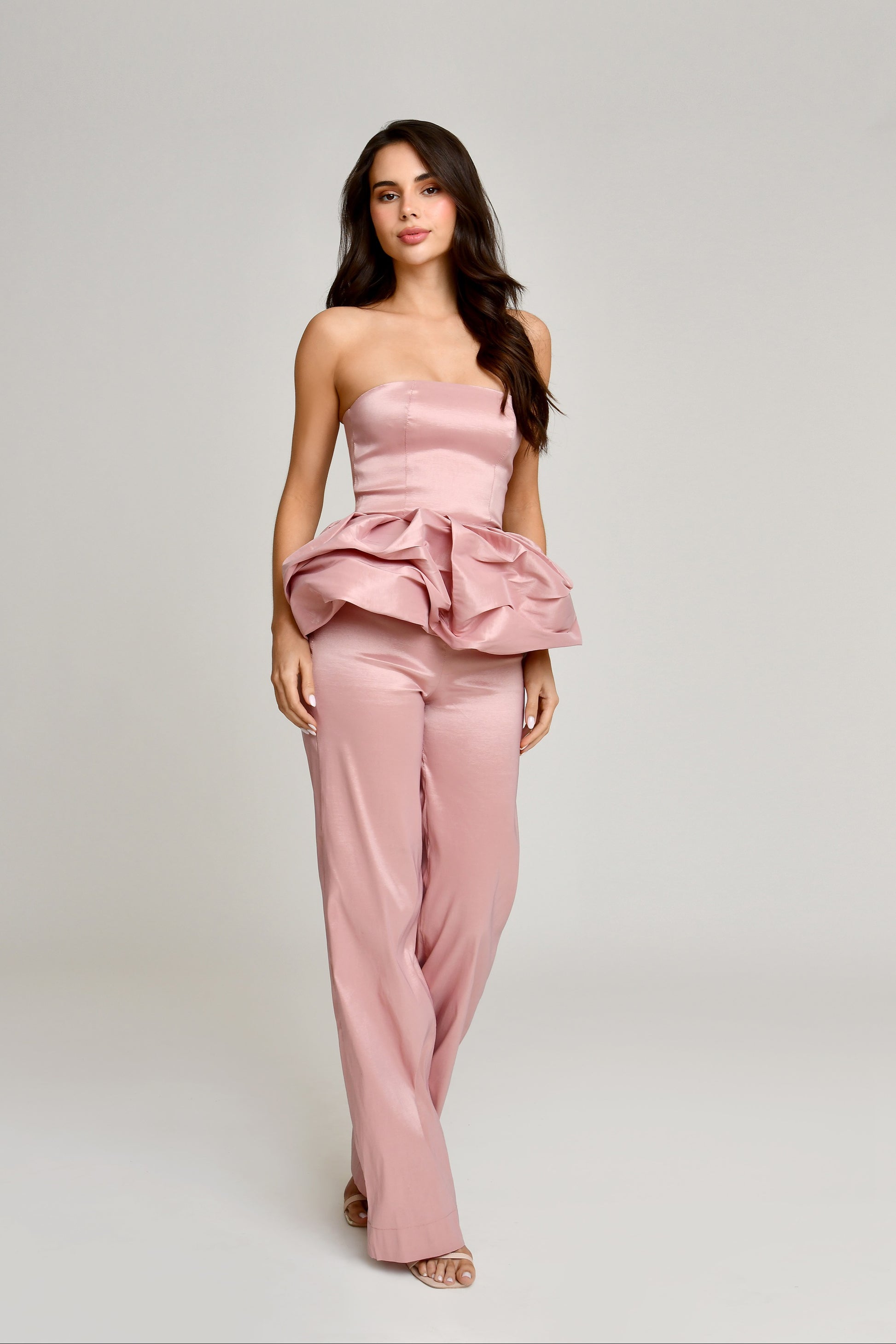Set pantalón + top strapless con péplum en tono rosa blush.
