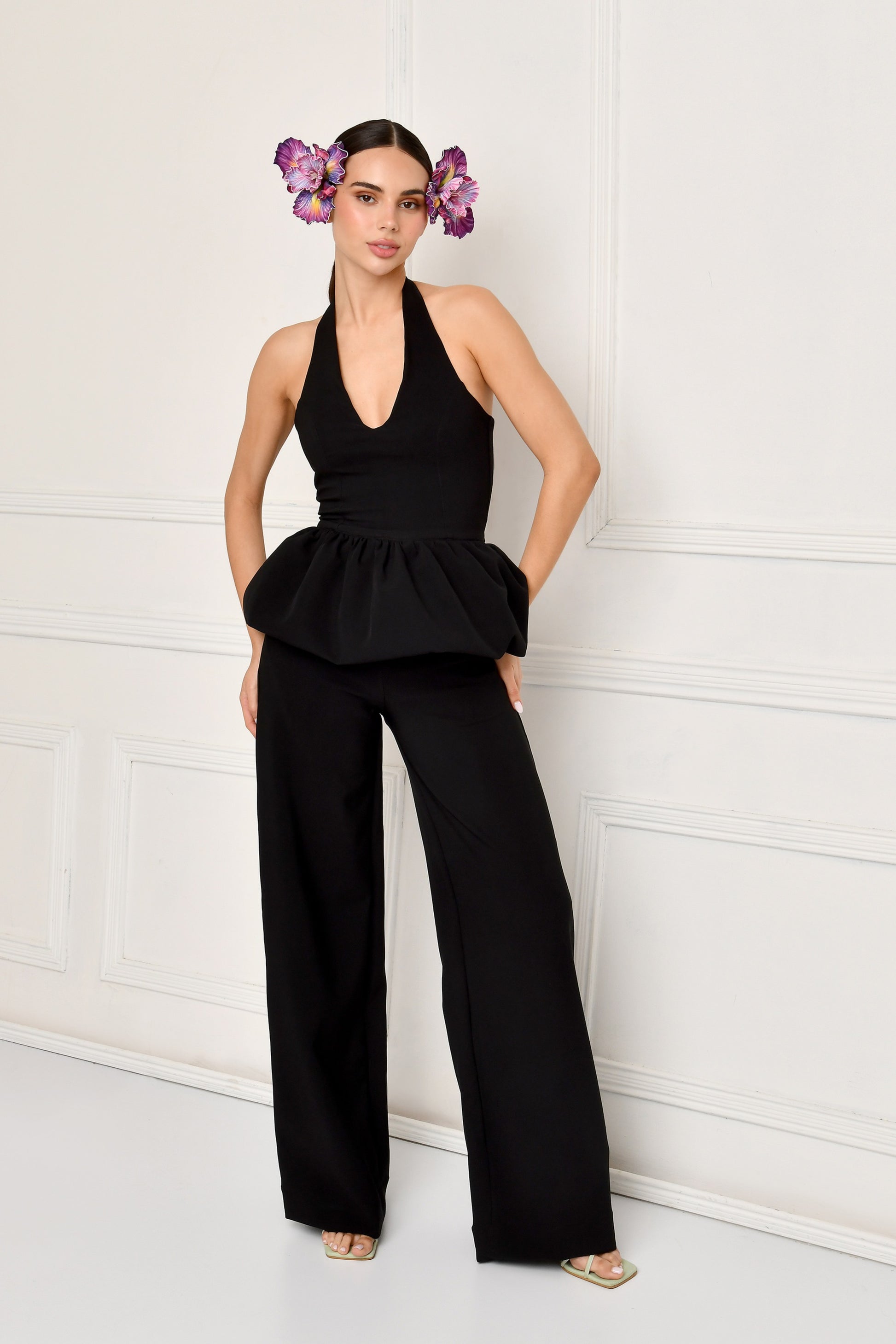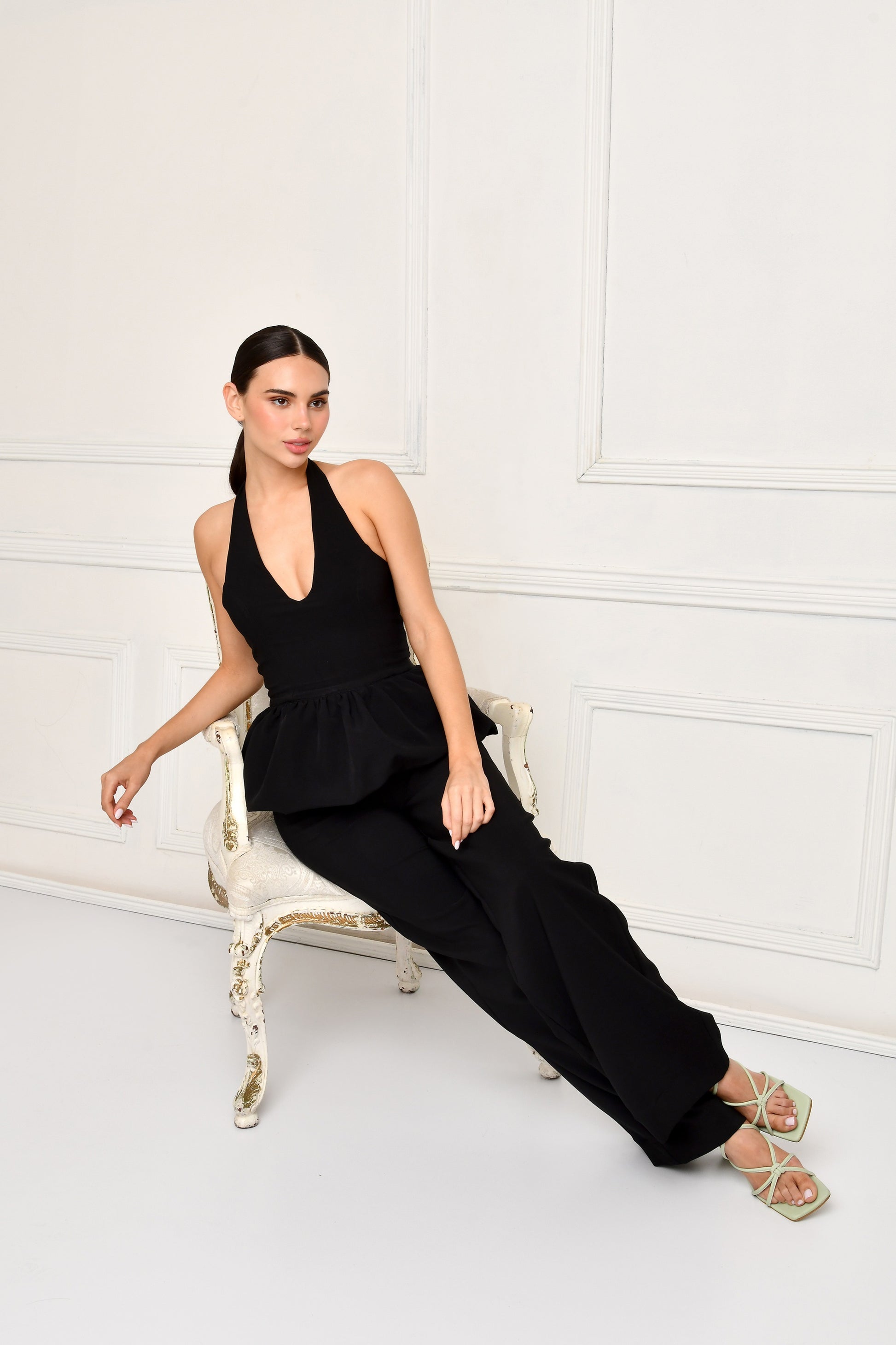 Set de dos piezas en color negro, elegante y versátil. El top halter presenta escote profundo en V que estiliza el cuello y realza la figura, acompañado de un péplum voluminoso que marca y afina visualmente la cintura. El pantalón de tiro medio y pierna ancha incluye prácticos bolsillos laterales, aportando comodidad sin perder sofisticación.