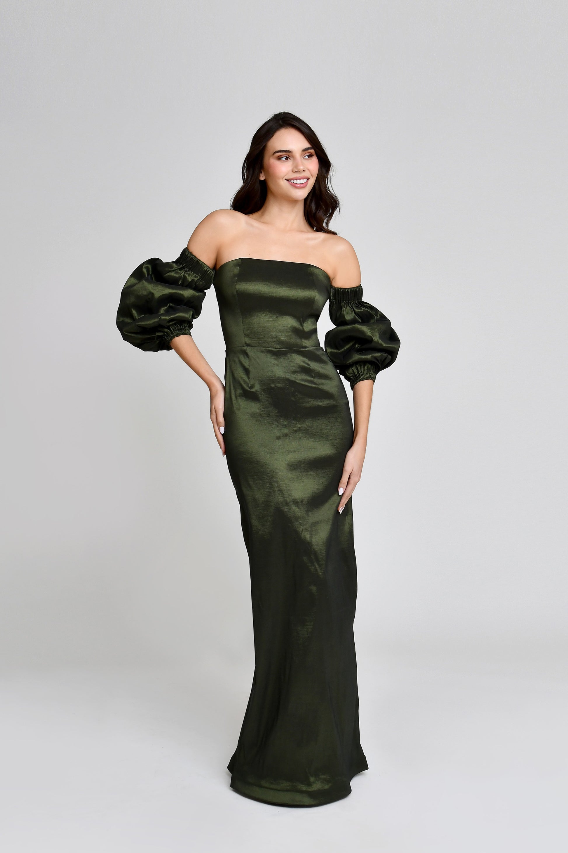 Vestido largo off shoulder con mangas abullonadas en tono verde oliva.